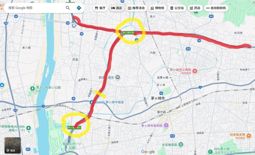 从上面几幅画面中可见,他们上了付费公路“Shin-Shonan By-Pass”,且上路之后前方还有1km抵达“茅崎中央”,反方向的路牌表明还有2km就是前往茅崎海岸的出口。根据这两个条件,倒是可以找到正确地址:在图中红色标出的这条“Shin-Shonan By-Pass”付费公路上,我用黄色短线标出了离两个关键地点距离正确的位置。